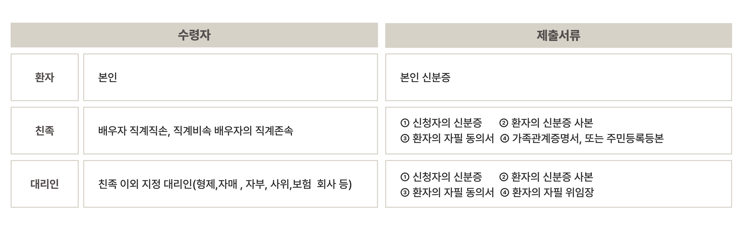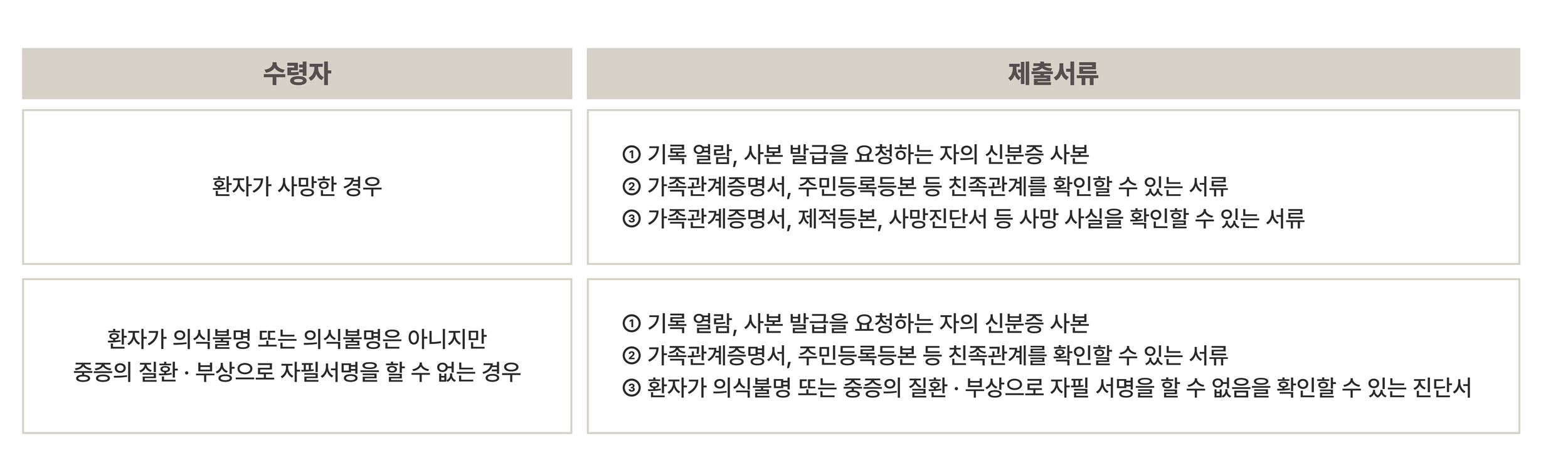 본인, 신청자의 신분증(국가기관 발급 신분증) / 환자의 신분증 사본(국가기관 발급 신분증, 만 17세 미만은 제외) / 환자의 자필 동의서(만 14세 이상 작성)